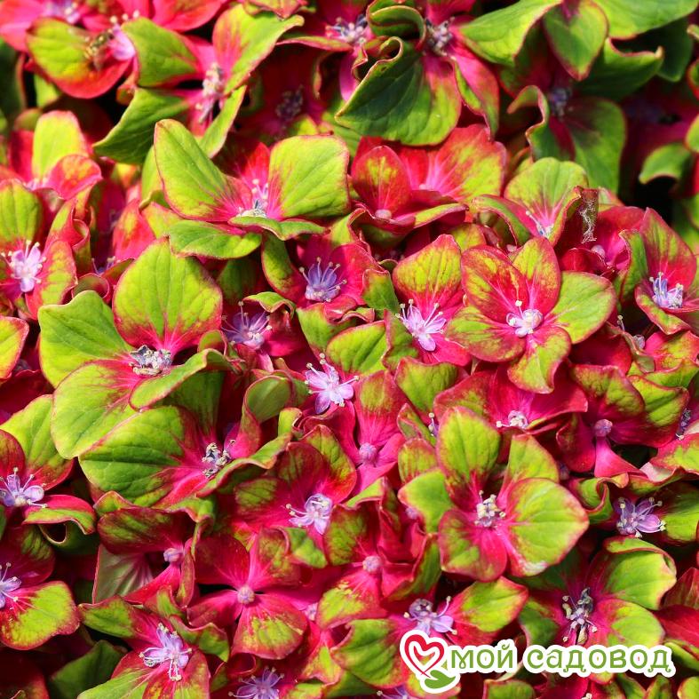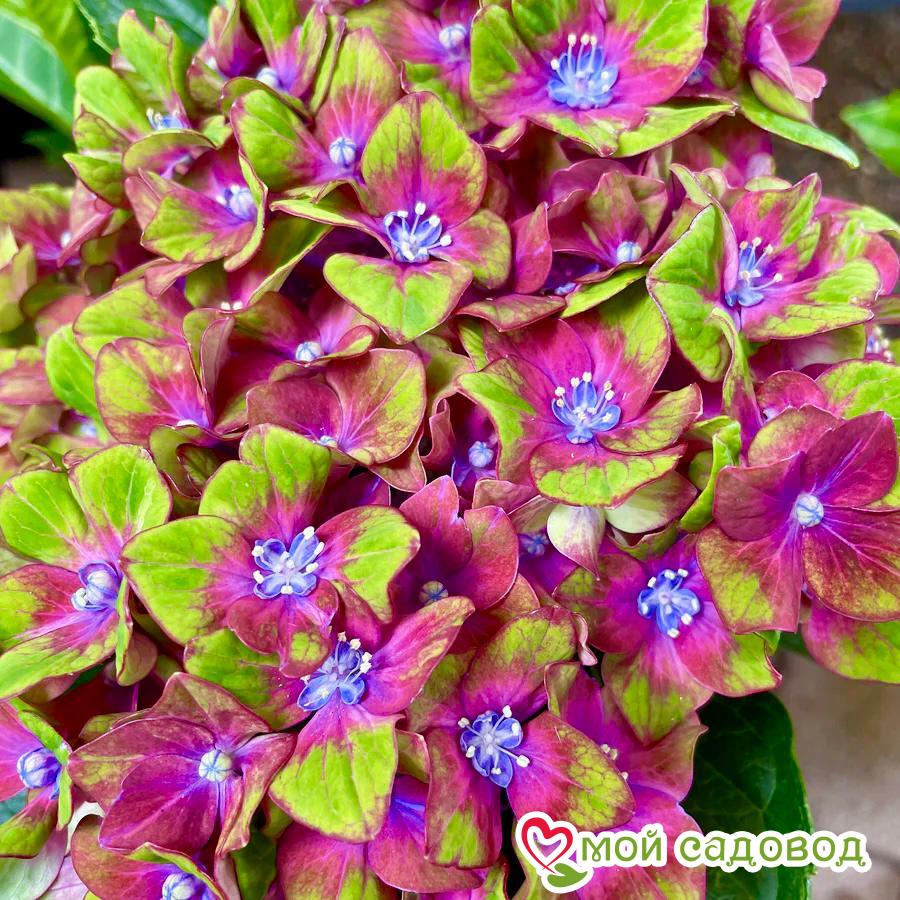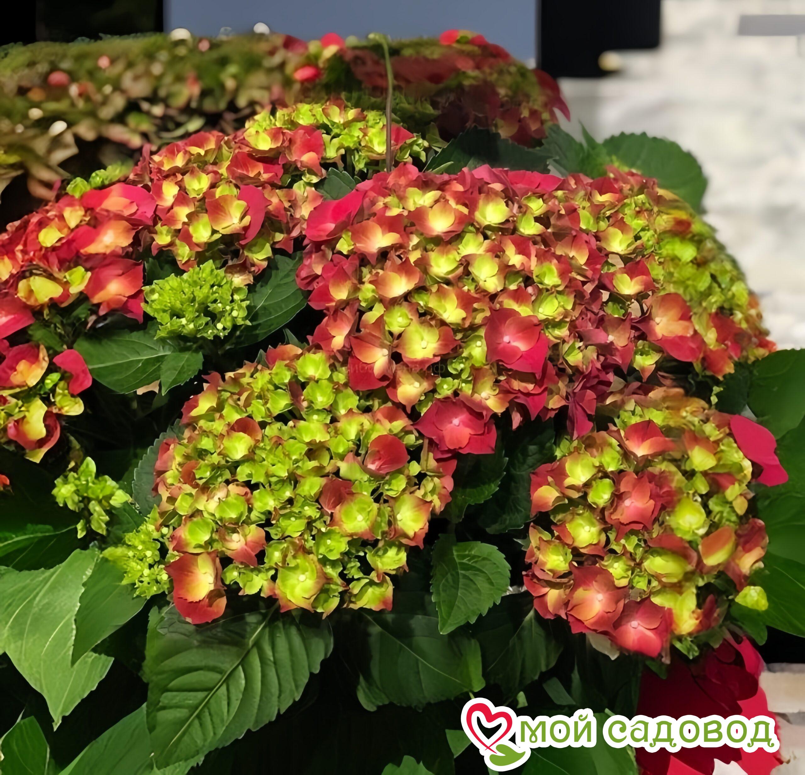 Читать далееКрупнолистная гортензия Saxon Schloss Wackerbarth — помпезный сорт крупнолистной гортензии, выведенный немецкими селекционерами совсем недавно в 2011 году. Куст компактный, с сильными стеблями, вырастает в высоту до 70-100 см.. Цветение роскошное соцветия-зонтики шаровидной формы, размером от 12 до 20 см в диаметре. Они состоят из маленьких стерильных цветков зеленого цвета, которые окружены чашелистиками яркого цвета. Данный сорт очаровывает трехцветными соцветиями. Розово-красные лепестки с желто-зелеными пятнами и привлекательный ярко-голубой центр не оставят равнодушными никого. Чем более кислая почва, тем более насыщенный голубой цвет. К концу цветения лепестки зеленеют. Листья заостренные, зубчатые, зелено-красного цвета. Побеги — одревесневшие однолетние. Цветение обильное и продолжительное с июля по сентябрь.
