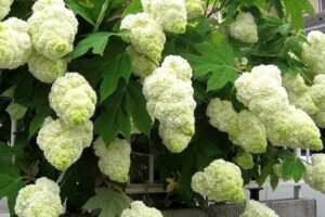 Кустарник достигает 2 м в высоту. Побеги мощные, красновато-войлочные. По всей длине они покрыты 3-7-лопастными листьями (как у дуба). Благодаря такой особенности сорт и получил свое название. Окрашена листва в два цвета – сверху в темно-зеленый, а снизу в белый. Осенью примешивается оранжевый, насыщенно красный или бордовый оттенок. Длина листовых пластин – до 20 см. Соцветия конической формы, длиной до 30 см. Поначалу лепестки белые, но по мере отцветания становятся розовыми. Цветение начинается в июне и заканчивается в августе.